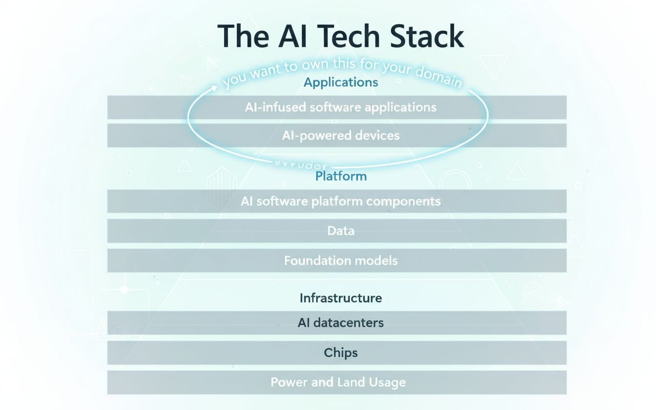 Speaking of distribution, as an entrepreneur you might want to consider where in the AI stack you fit. For example, you probably won’t be making energy, or chips, or even data centers. All these require large amounts of capitol expenditure that are out of reach for the average entrepreneur. However this isn’t necessarily where you want to be, you actually want to be at the top of the stack.